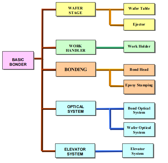 系统由多个模组分别是引线框架叠式载具、晶圆工作台、工件台、绑头组件、多料盒输出升降台、传输轨道、邦头运动组件等!