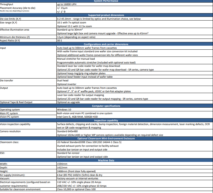 实现工艺为根据预先设定的特性将晶圆分为几类。 能够以 +/-15µm 精度实现高达 16,000 DPH 的吞吐量, 支持所有晶圆图格式和 SECS/GEM 采用洁净设计Class 100规格的洁净室环境!